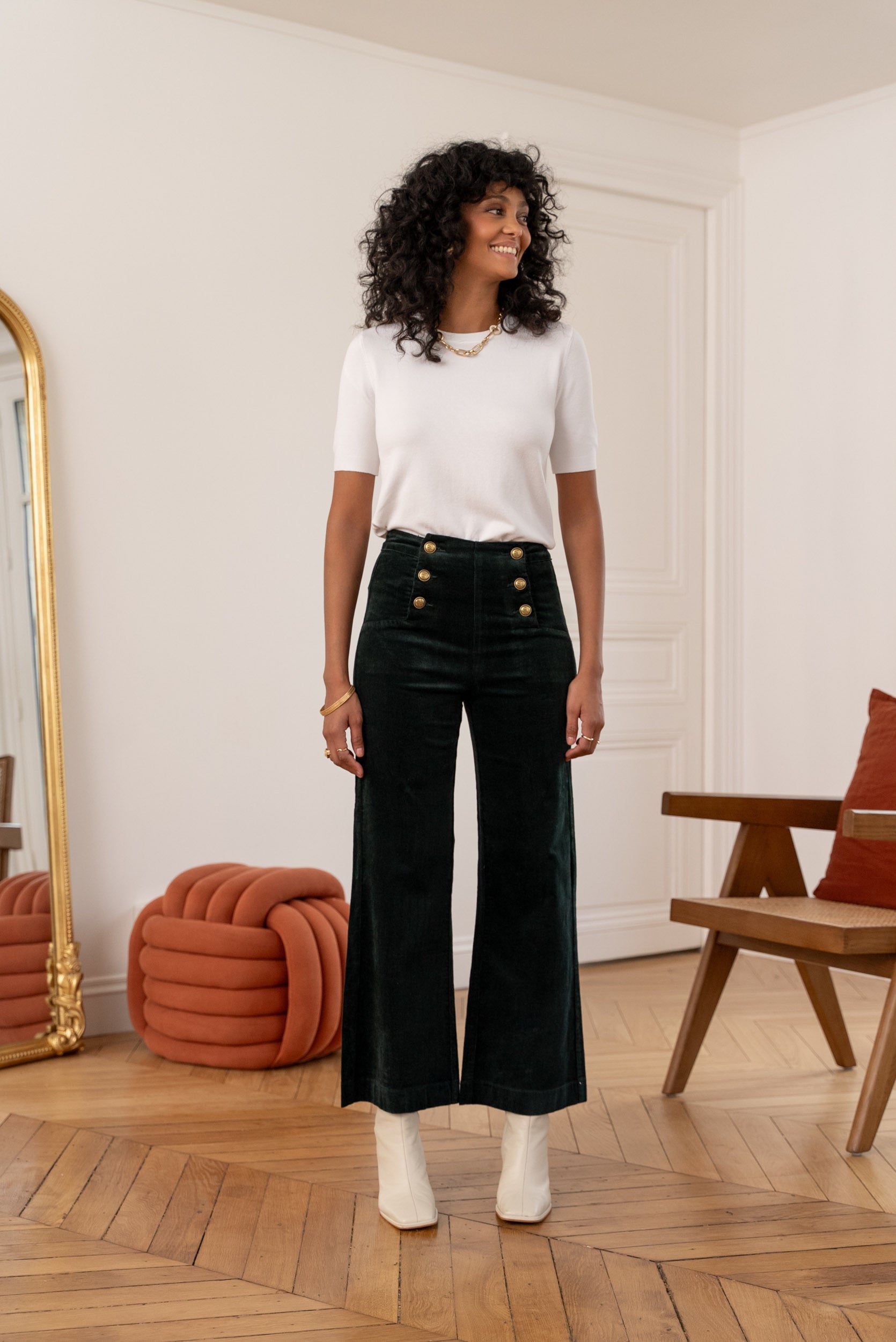 As calças Victorine são calças de veludo de corte amplo com botões frontais que lhes conferem um visual muito sofisticado e elegante.