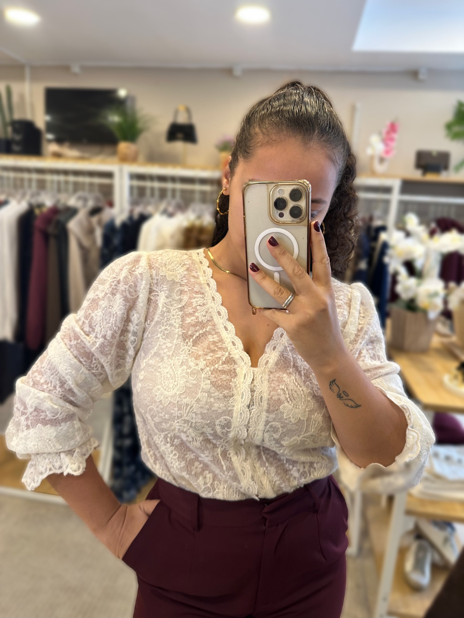 Camisa rendada com decote em V