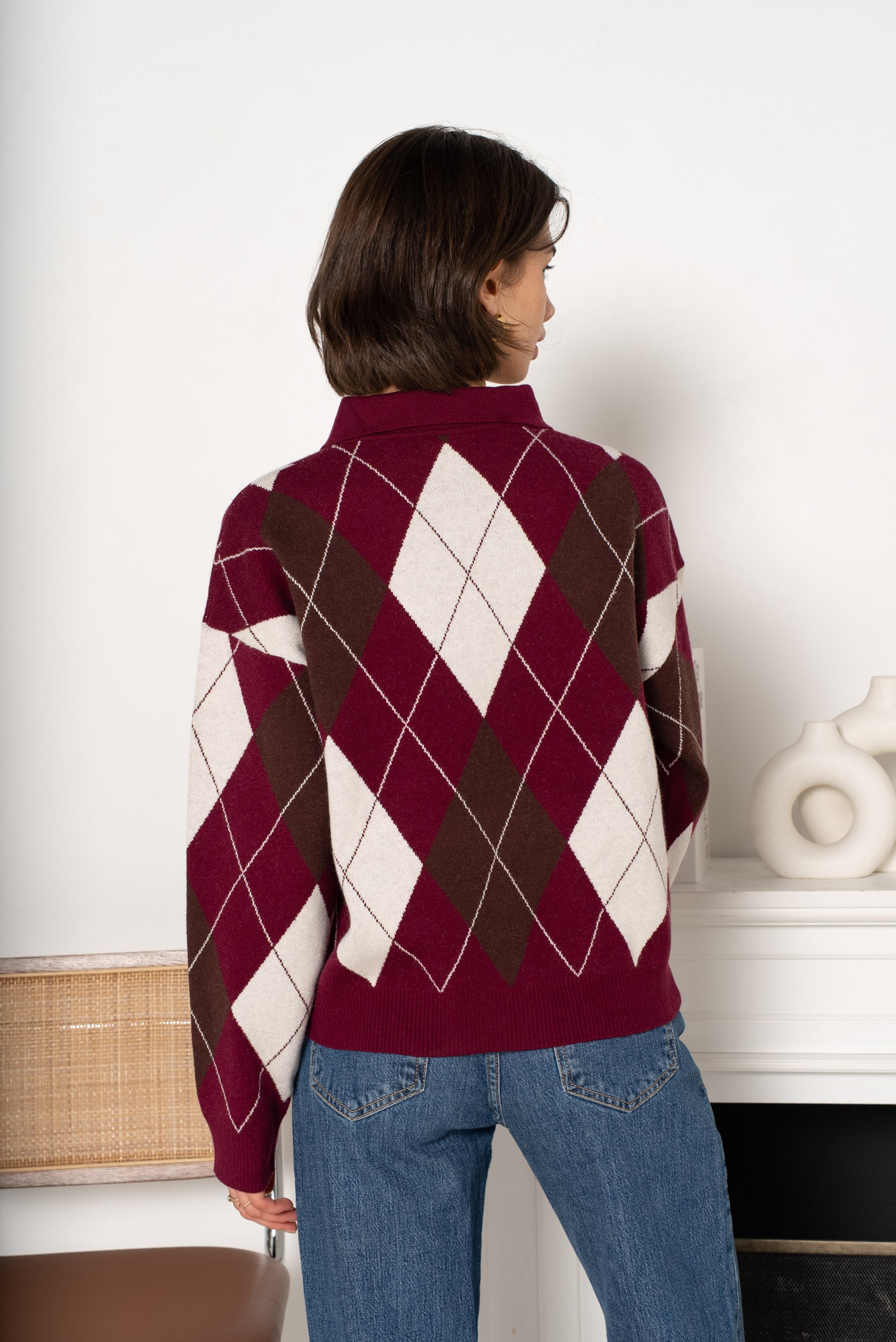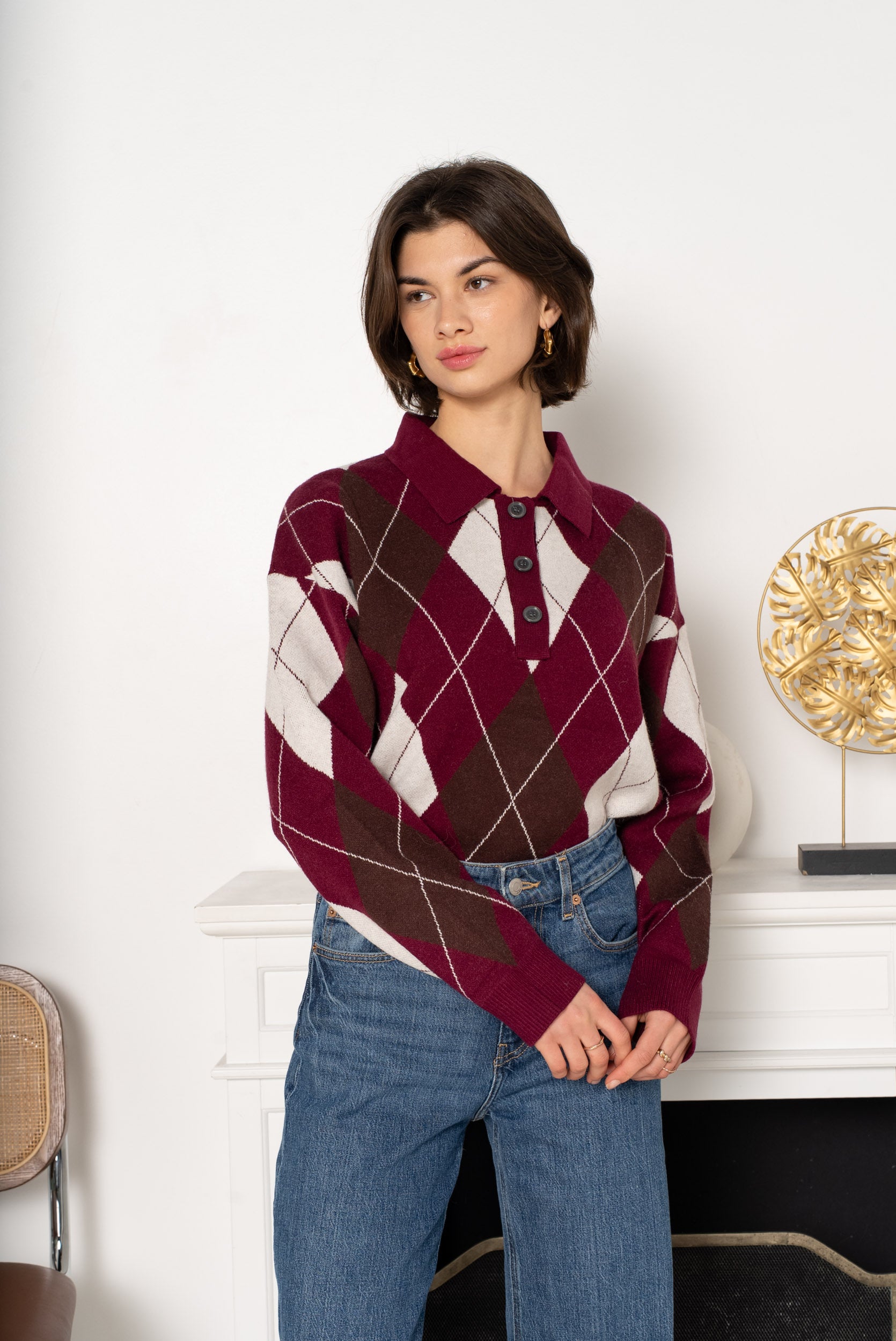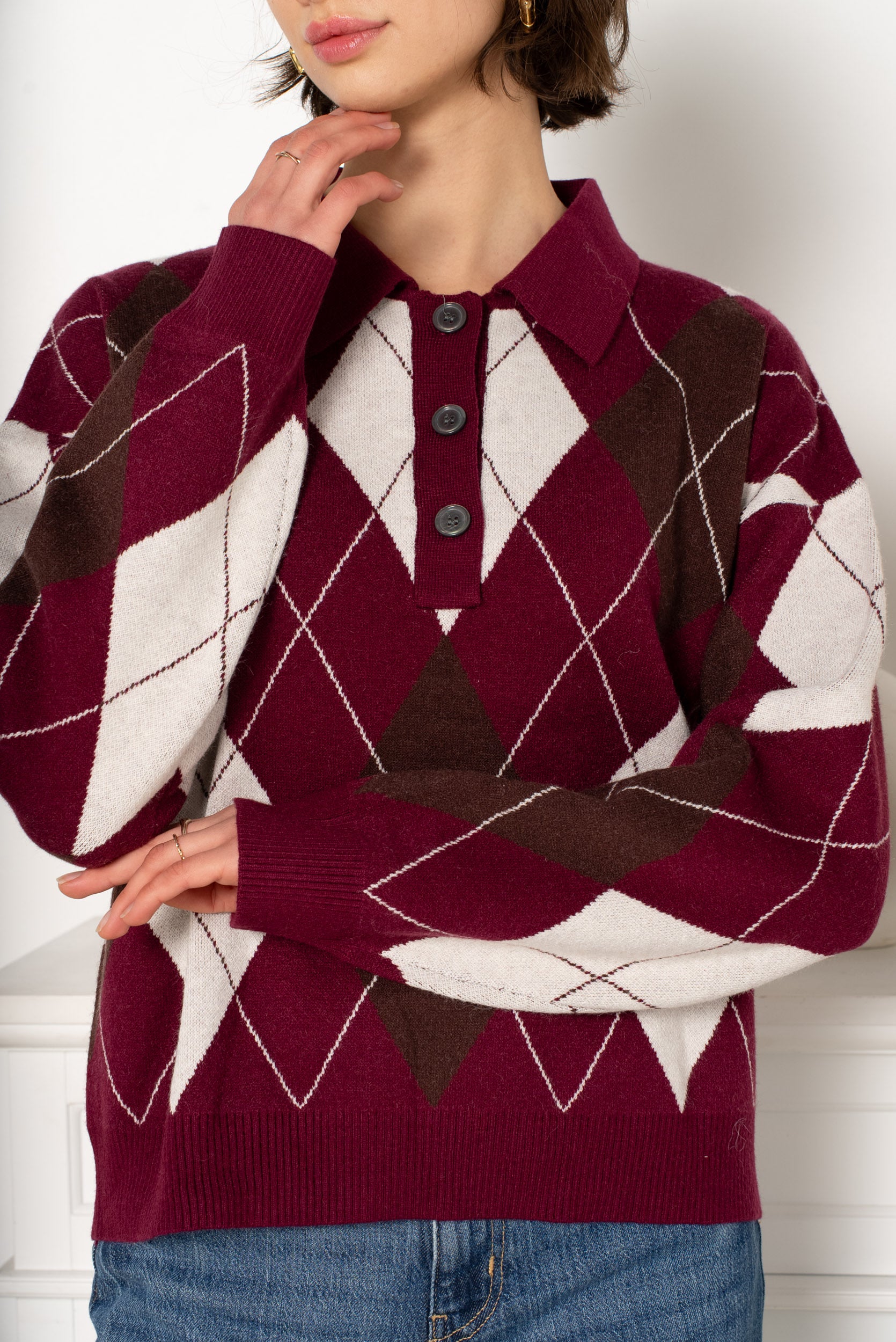 Malha losangos, com botões até ao meio.