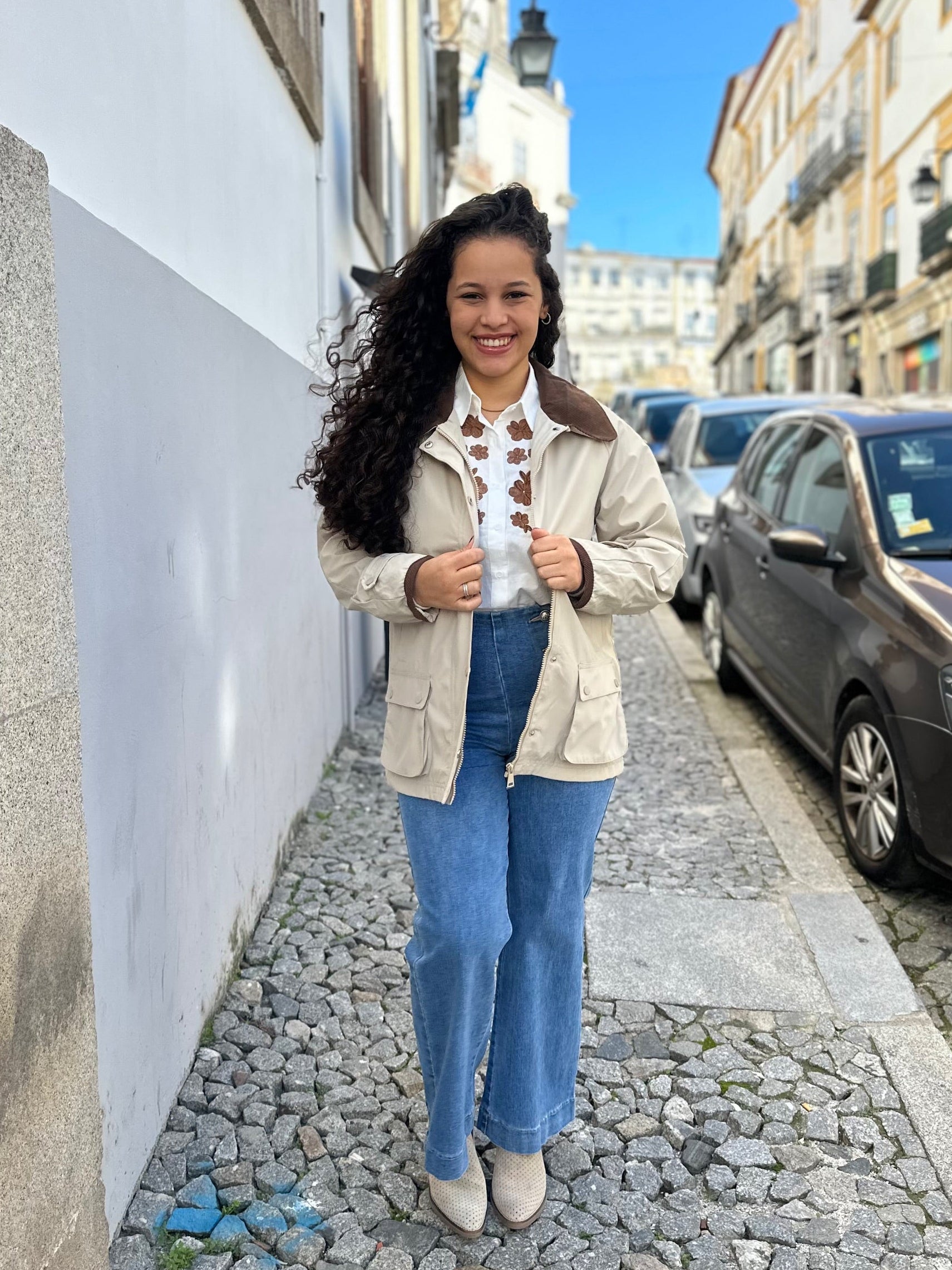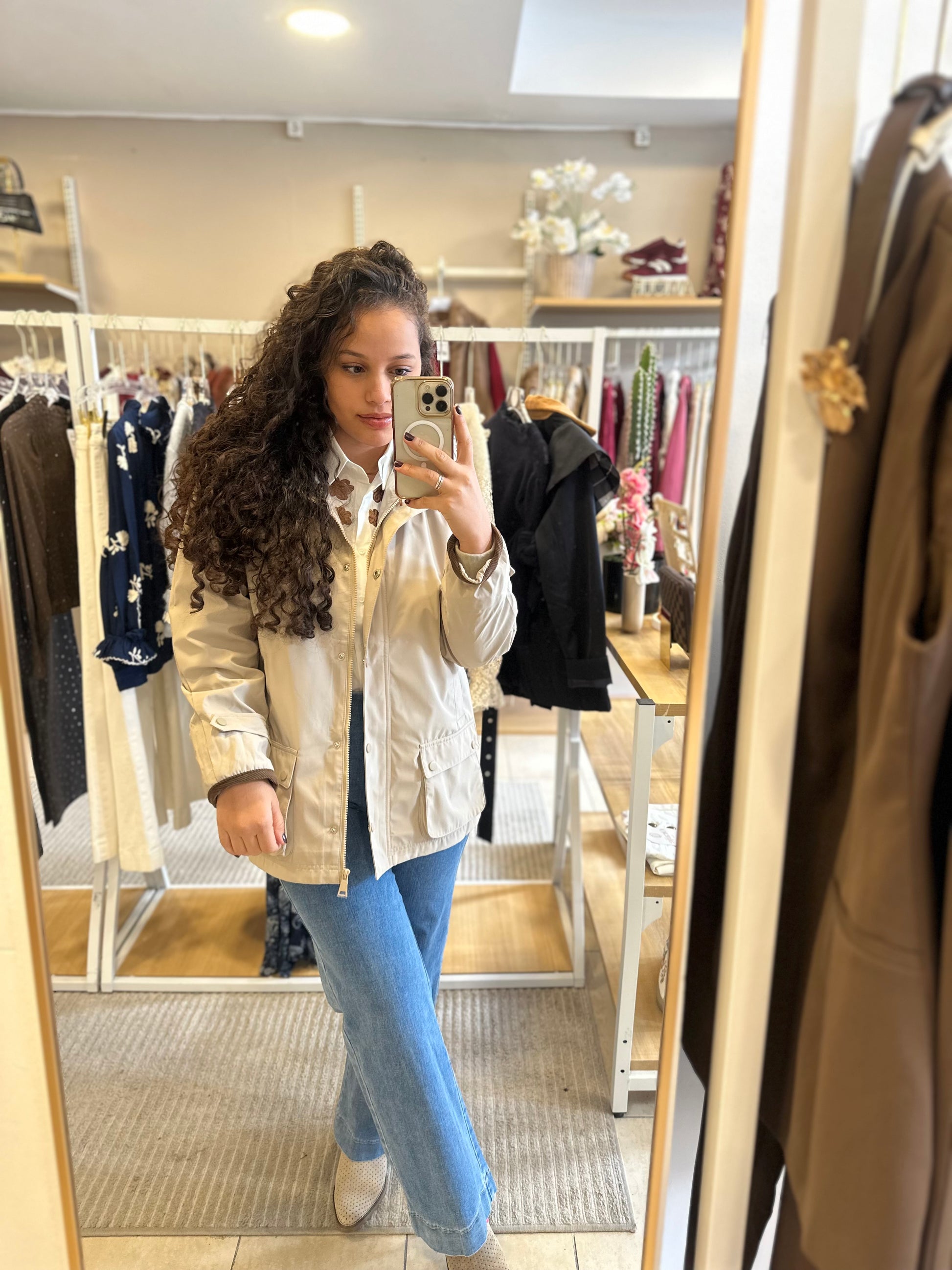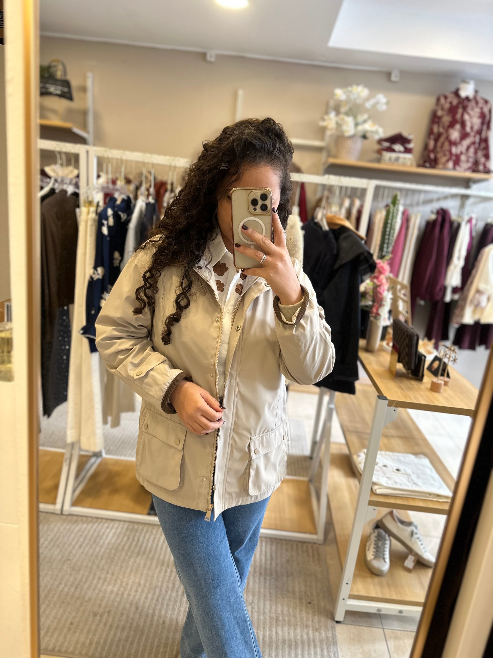 Casaco creme resistente à chuva, gola e manga com detalhes em castanho.